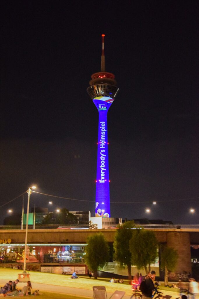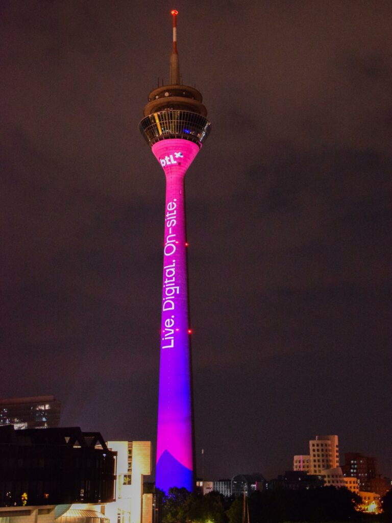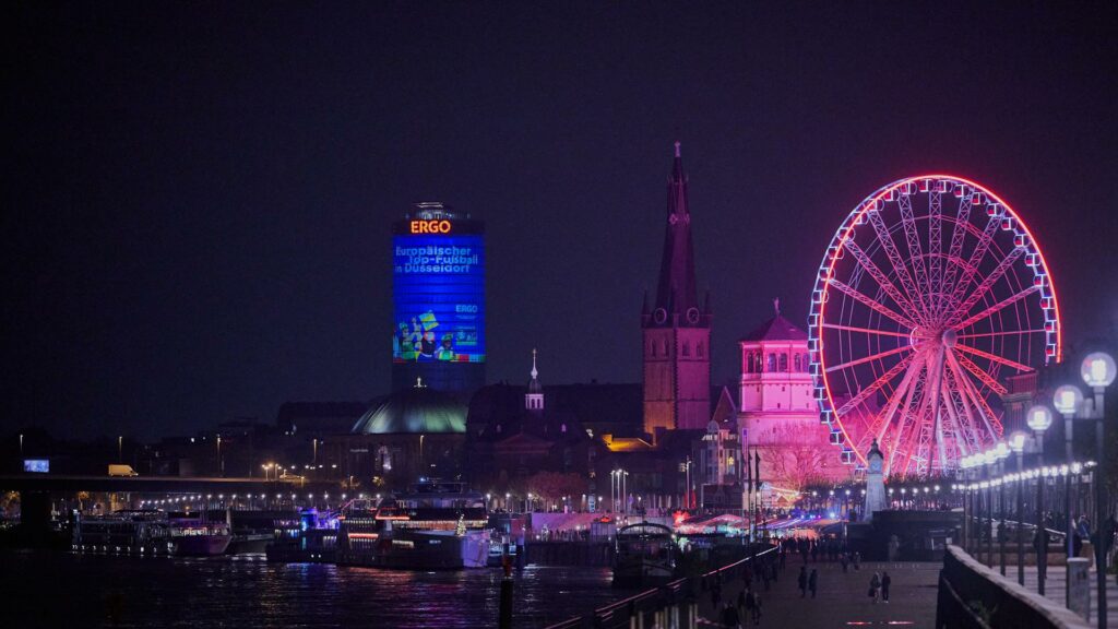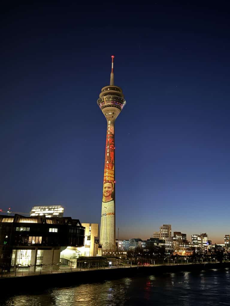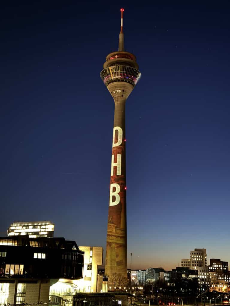 Wir haben nicht nur den ERGO-Turm zur Auslosung der UEFA EURO 2024 durch Gebäude Mapping in Szene gesetzt, sondern auch anlässlich der Handball-EM den Rheinturm erstrahlen lassen – absolute Highlights!